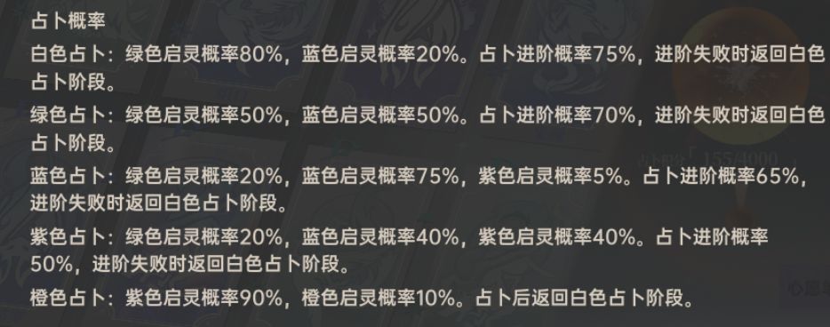 万抽期望为82张(含保底),每张期望消耗为10408 算的粗略概率,可能存在计算错误之类的问题,仅供参考,下面是推导过程 用马尔可夫链先计算出各占卜概率分布(图四),再进而计算橙启灵的概率(图六第一位,矩阵a11),均保留小数点后四位。 根据官方规则可以列出图三,然后得出无保底下各占卜的概率(图四)为白35.88%,绿26.91%,蓝18.84%,紫12.25%,橙6.12% 保底这边用4000分