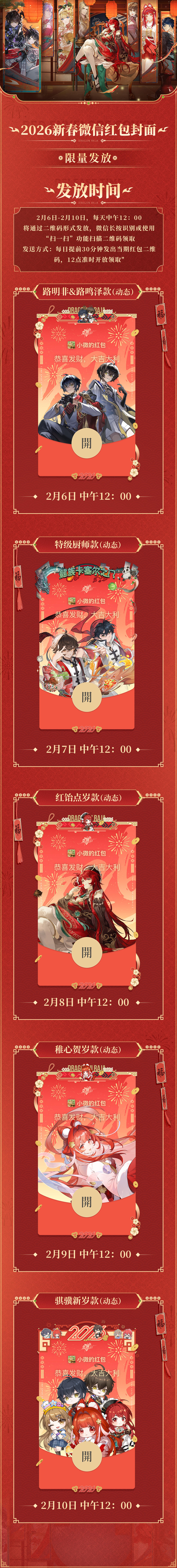 亲爱的专员,骐骥新岁,龙马精神!《龙族:卡塞尔之门》2026新春限定微信红包封面即将于明日陆续发放!希望大家新的一年里一马当先,龙腾万里! ▶▶2026年5款动态红包封面发放时间◀◀2月6日12:00:路明非&路鸣泽款(动态红包封面)。2月7日12:00:特级厨师款(动态红包封面)。2月8日12:00:红饴点岁款(动态红包封面)。2月9日12:00:稚心贺岁款(动态红包封面)。2月1