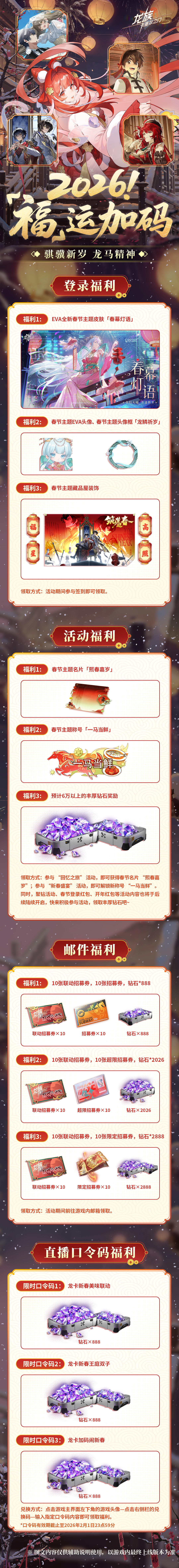 亲爱的专员,《龙族:卡塞尔之门》「骐骥新岁 龙马精神」新春版本预告第二弹已送达! ▶▶2026 “福”运加码◀◀1、2026登录福利:EVA全新春节主题皮肤「春幕灯语」,签到即领。2、2026登录福利:EVA春节主题头像、春节主题头像框「龙鳞祈岁」,签到即领。3、2026登录福利:春节主题藏品屋装饰,签到即领。4、2026活动福利:春节主题名片「熙春嘉岁」,参与“回忆之旅”活动获取。5