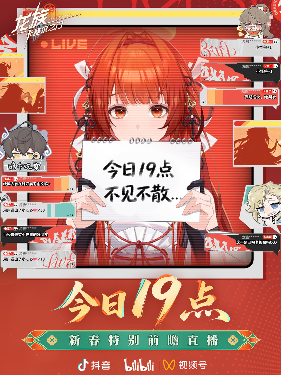 亲爱的专员,《龙族:卡塞尔之门》「骐骥新岁 龙马精神」新春特别前瞻直播即将于今日19点惊喜开启!本次前瞻直播将由绘梨衣为大家揭晓卡塞尔学院新春特别版本内容!新春专属福利、全新联动活动、全新限定伙伴、全新联动皮肤等惊喜内容尽在今日19点官方直播间!▶ 直播时间:今日19点▶ 直播内容:卡塞尔学院新春版本重磅爆料、新春专属福利、全新联动活动、全新限定伙伴、全新联动皮肤等惊喜内容▶ 官方抖音直播