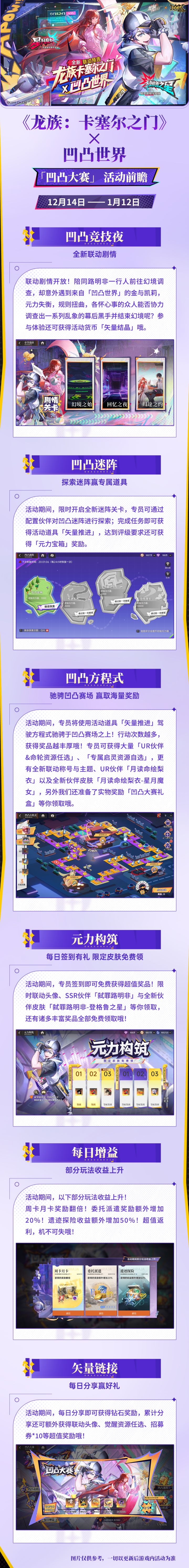 亲爱的专员,《龙族:卡塞尔之门》x《凹凸世界》全新联动活动现已开启! 弑罪路明非全新皮肤「登格鲁之星」& 月读命绘梨衣全新皮肤「星月魔女」已同步上线! “是要一起去冒险吗?我已经准备好啦。” ▶时装效果 「月读命绘梨衣-星月魔女」:全体上阵伙伴攻击,防御,生命+3% 「弑罪路明非-登格鲁之星」:全体上阵伙伴攻击,防御,生命+2% ▶获取方式 活动期间,专员们累计签到达指定次数即可免费领取全新皮