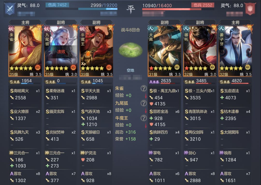 不是把强的将和技能都放在一队就能发出最大实力,前几天小卡包出了牛魔王,我二话不说就替代谛听放在了威慑妖火队,出去打架被姜大拿胖揍的时候才发现不对劲,原来是因为敌方普攻牛魔王才有额外效果,类似于反击。而九尾和技能给对面威慑的不能普攻了。