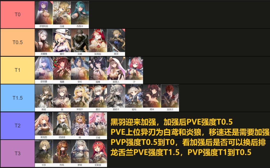 PVP的T0:鬼侍,罗亚(3命),龙舌兰,杰西卡,黑羽(3命),抚慰师,伊涅利丝,灵遥,狄利丝,芙蕾雅 炎狼鬼魅猎鹰也在pvp打工但根据环境判断T0还是T1,白鸢排到这也行但是一般pvp死的比较快 颂道使部分环境T0,专门切人后排的一张卡,不过你一般总攻是给抚慰师的 PVE的T0:鬼侍,列蒂西雅,白鸢,抚慰师,伊涅利丝,灵遥 深渊副本T0(水dot):猎鹰,赦罪人,艾瑟儿,舒芙蕾,阿斯特莉娅,缇米