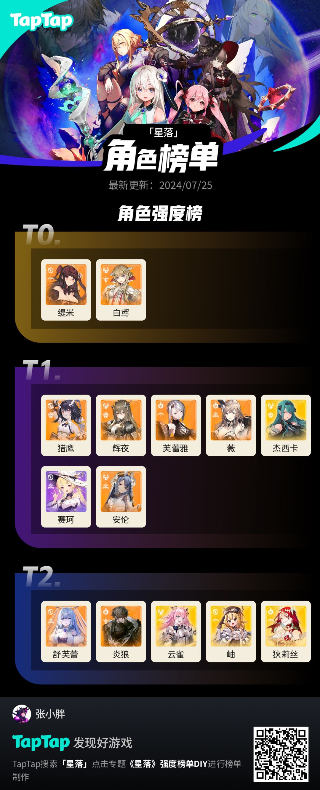 #星落强度榜 ‼️‼️‼️‼️‼️个人感觉,有的角色等级养成不够,看法比较客观,勿cue, T0 🎉猎鹰:小号,60级2破,伤害比较乐观 🎉芙蕾雅:小号60级2破,总攻持续伤害,可观 🎉缇米:大号90级3破,对群伤害可换(pve),肉鸽推图好用 🎉薇:90级3破1命,球球伤害稍微不是很够目前感觉,可能需要觉醒 🎉炎狼:两个号都没抽到,但看不少人用应该强度在线 🎉白鹭:90级3破,总攻两个光环为持