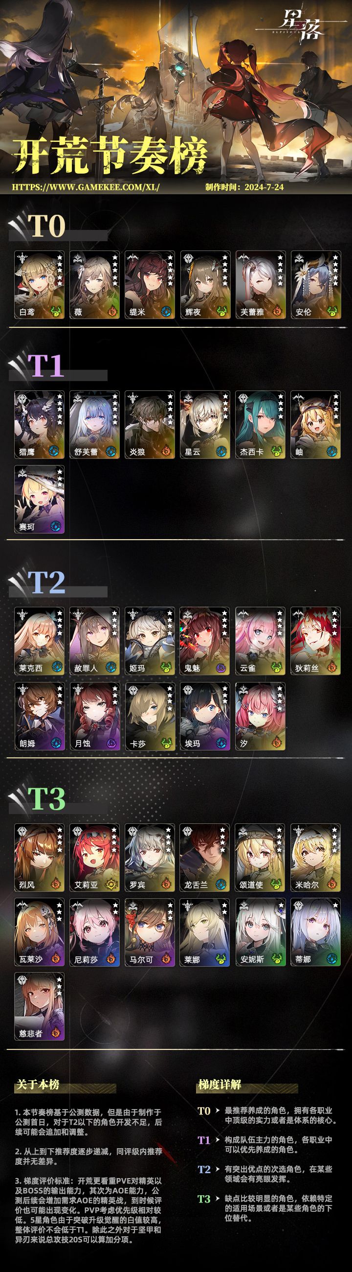 以上榜单仅在游戏开服至8月5日生效,8月6日新增木弓伊涅利丝,泛用性极强,1命质变,可单可群,PVP零命也强,表现优于提米(甚至是提米的上位替代),幻象实力有待检测(技能机制摆在那,估计还是很强就是了) T0:泛用性极强 T1:养了不亏 T2:在特定环境或配队有用 T3:偶尔也会有用 该榜单可以随便骂,作者不会用出任何一个字或者一个标点符号进行反驳 划重点:该榜单为平民向榜单,金卡一律视为三觉,仅