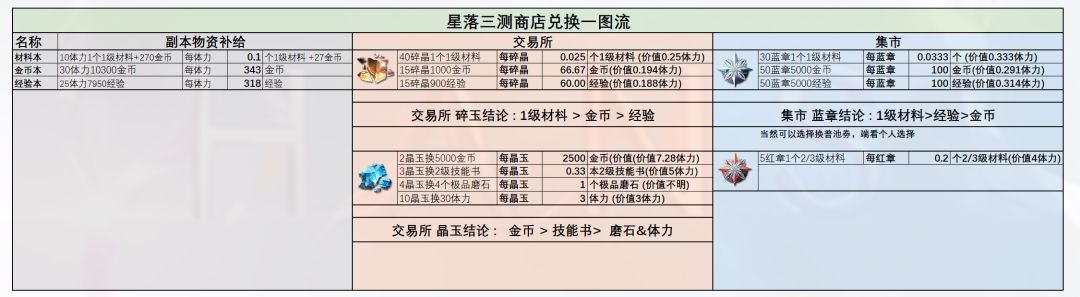 前期各种资源都缺, 换金币,换经验,还是换材料? 一图解君愁。 题外话 : 掌管其他攻略的神明,需要有足够的神力才能凝聚出图片降示, 神力需要靠一众信徒集愿, 其具体收集方式为点赞 (+114神力) , 收藏(+514神力) 转载(传教士行为) 请注明作者,谢谢 --------------------------------------------------------------------