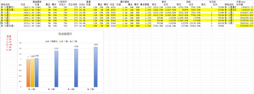 关于新角色枭,该图是180s、第四个放总攻、无队长技和额外增益下,不同星级枭在理想刻印、英勇徽章情况下输出对比。 补: 如图,经过计算,五命枭暴击羽毛伤害期望更高。 总结:0命或三命,带暴击率羽毛。 ———— 星落交流群:481170970,欢迎大佬、萌新来玩。 #星落 #星落人物攻略