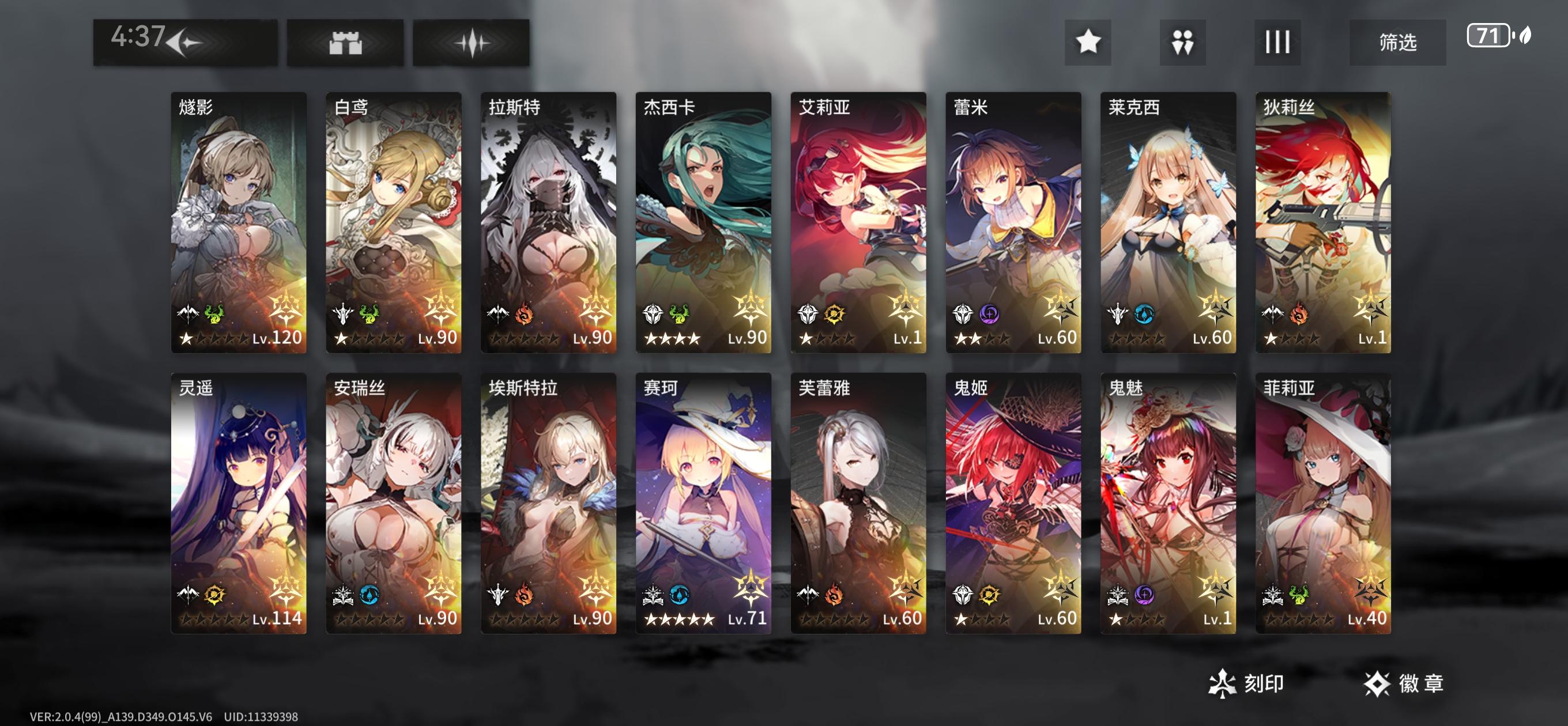 玩了480天,虽然很多box没补齐,但是关键角色都有了,已经是属于高战玩家之一,公会战这期表现也还行(谁说咱零氪玩家不能和微氪党比较?),周卡诱惑确实很大但我还是忍住没买,一直都是零氪状态,得益于我的欧气和屯屯鼠光环加持(虽然最近两期卡池不咋地,安瑞儿90出的)幻象就真的无能为力了,最高好像也就六十多,你说jjc?我懒不想打嘿嘿刻印也是攒了好久,下个月才能升弓的270,徽章倒是运气也爆棚(图片