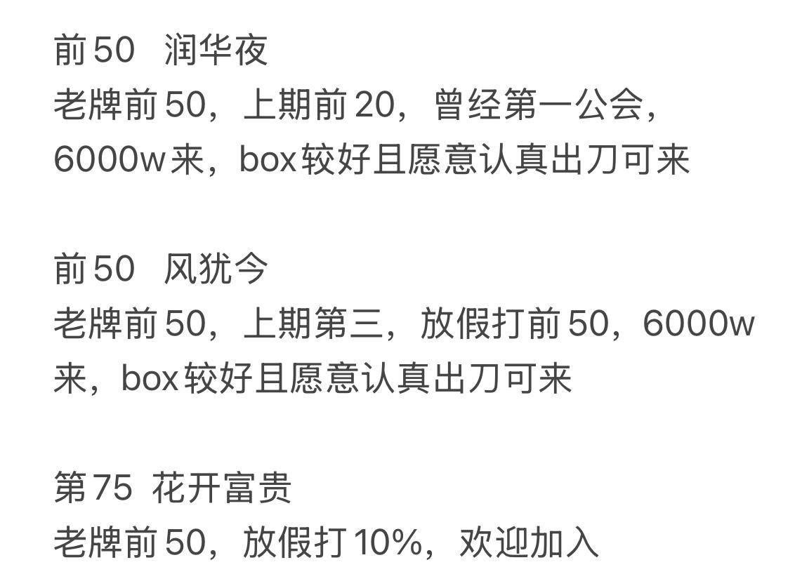 前五十公会招人啦,前五十还有几个位置,上期6kw+的来~萌新也有公会,搜悠久之树,雨花台或者雍华庭,都有位置,如没位置进群喊群主清人。群吹水用的,加不加公会都可来,桜和亭老人都在有问题随便问。公会版图一档前五公会1-桜和亭二档前五十公会14-从零开始的星落19-益禾堂27-乐逍遥37-双休日三档10%公会66-雨花台86-悠久之树7%-雍华庭欢迎各位大佬和萌新来玩啊,群号