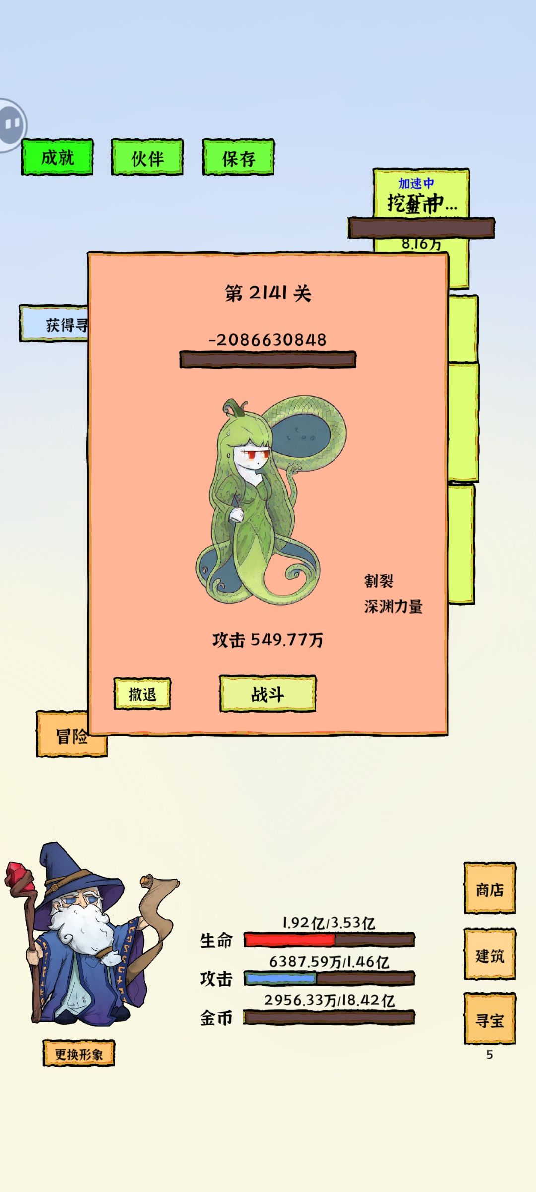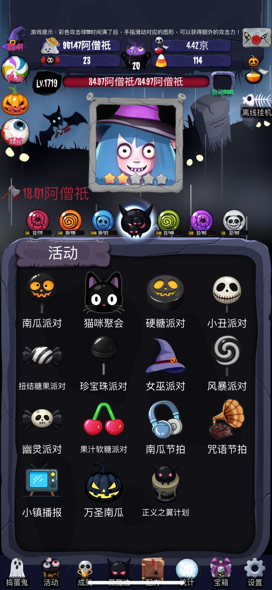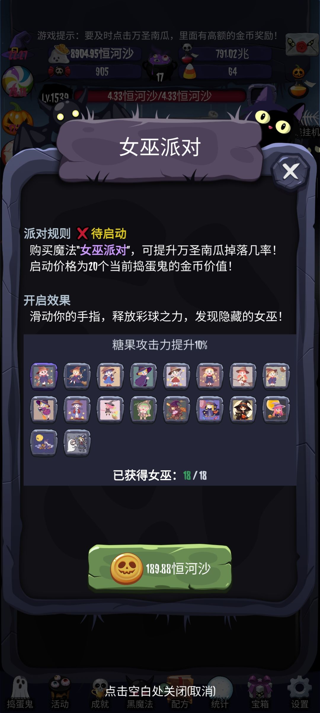 上面的左边第一个是你赚取的游戏币,左边第二个是糖果可以开宝箱,中间那个罐子代表你转生次数,右边第一个是魔鬼糖浆转生获取的魔鬼糖浆数量,第一个要1兆,第二个是升级装备的。 魔鬼糖浆的加成为100颗才加1倍黑魔法攻击,所以建议一转打底也要100课再转,当然你也可以随意转,玩游戏玩的就是开心就好。 南瓜每隔一段时间出来一次,如果喜欢看广告可点击广告一次十倍 挂机流:刚开始挂机时间是3小时,所以记得