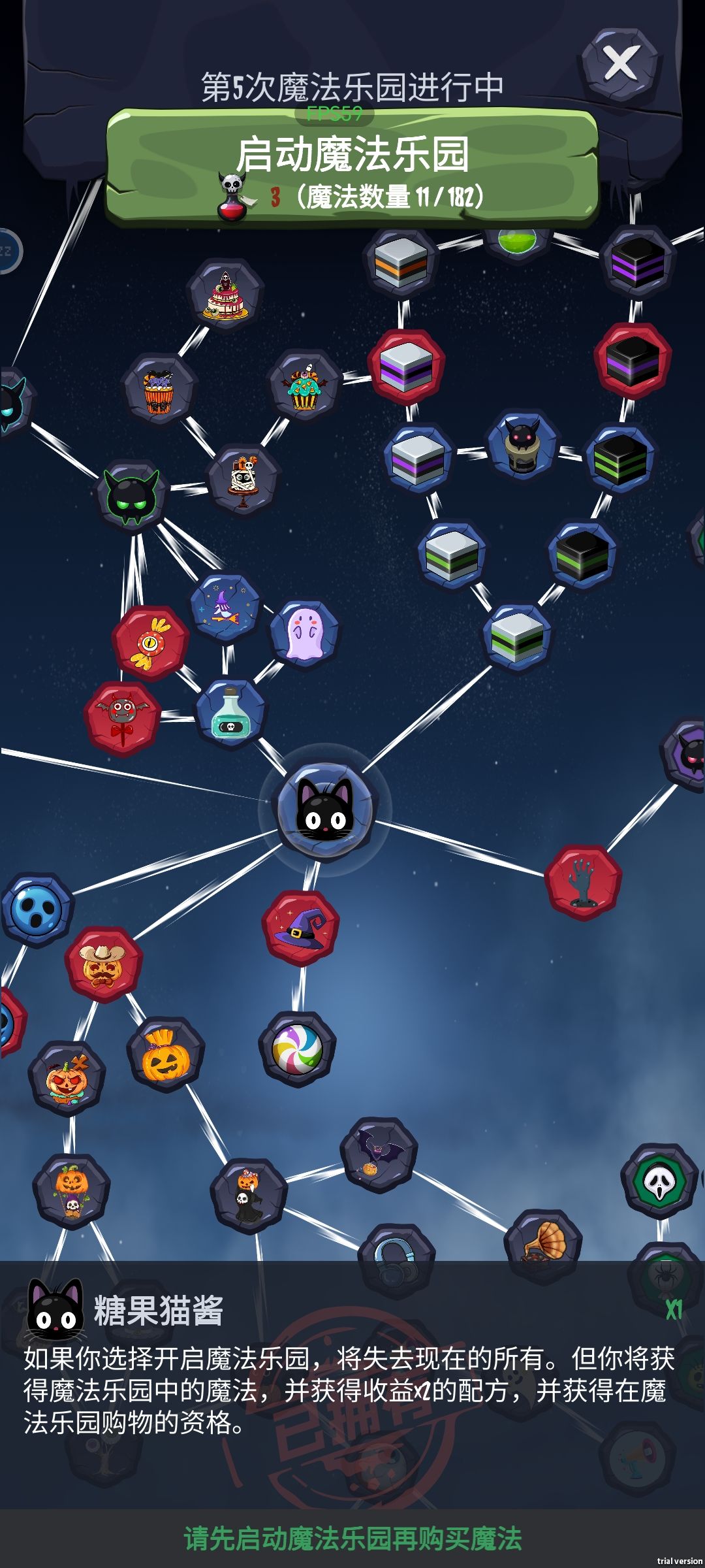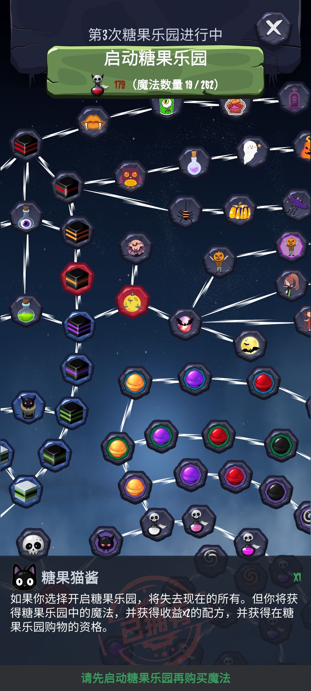 游戏核心目标>>> 击退捣蛋鬼,获得金币奖励。消耗金币购买黑魔法和配方,提升糖果攻击力,击退更多的捣蛋鬼! 黑魔法的购买方式>>> 黑魔法有对应的价格和提升的攻击力,积攒足够的金币即可购买。 前期推荐使用AI模式购买黑魔法,可以解锁出对应黑魔法的配方。 配方的购买方式>>> 每一个配方有自己的作用和价格。 目前共有769个配方,那不是要把手点断?后期在糖果乐园里有魔法可以开通一键购买功能! 财富密