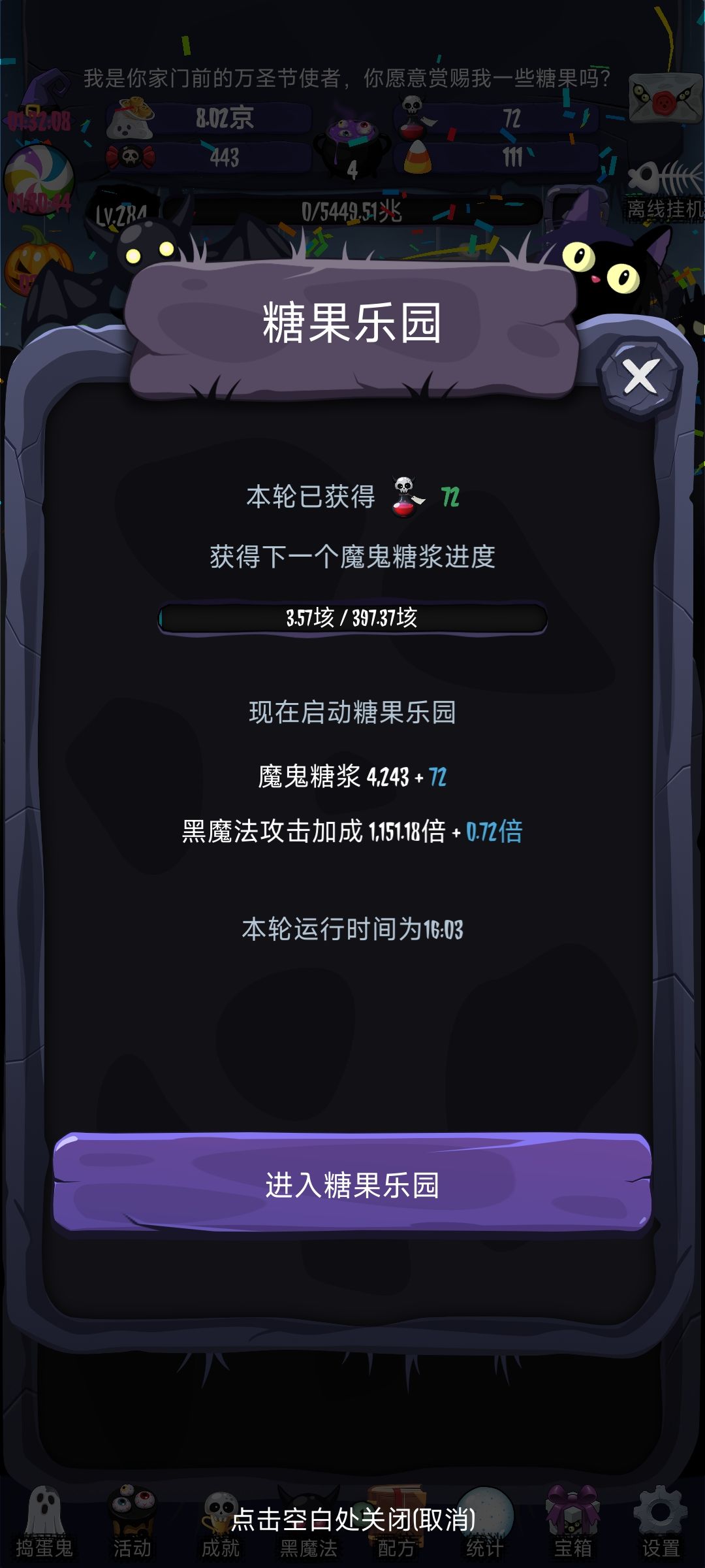1.黑魔法升级时,可以调到AI模式再点 2.圈出来的那个显示6的罐子,表示我是第6次转生,也是从这里进去糖果乐园。 糖果乐园可以参考下面这个攻略,前期第一转数量和第二转可以攒到一起。 https://www.taptap.cn/moment/444610964545865413?utm_source=copy&share_id=3173B1B1EBCA&utm_medium=share