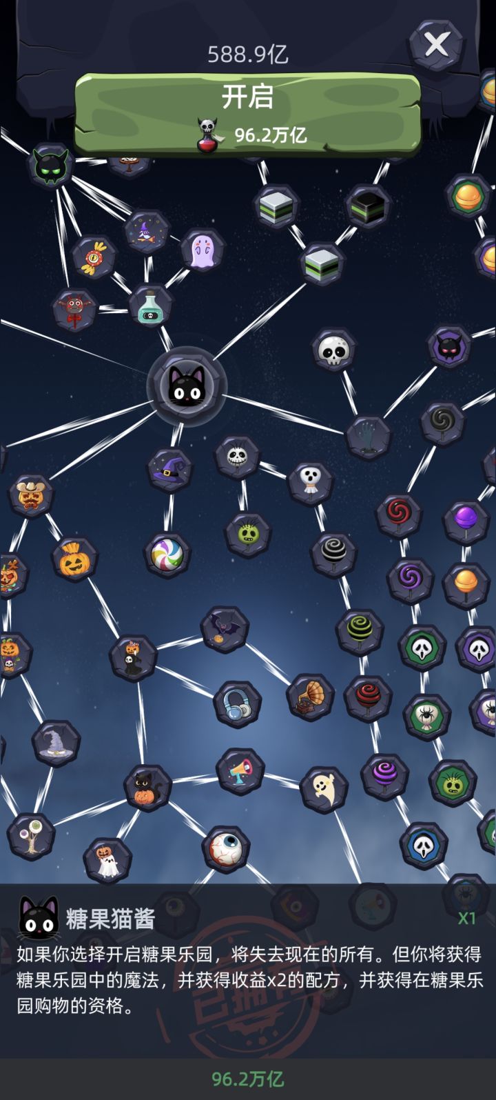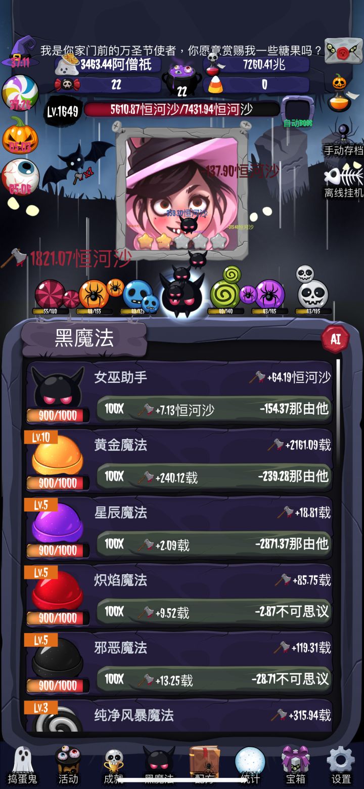很多大佬都说,一转先要憋着拿100+糖浆,二转憋3000+糖浆之类的……实操证实了一下,其实咱不需要憋着玩(看图1、图2对比)。首先,女巫来了是一款爬塔游戏,单局糖浆的获得数量和单局金币获得相关(注:糖浆获取所需金币会逐渐递增,如初始获取1糖浆需要1兆金币,那么2糖浆就需要1.5兆金币以此类推),那么爬层越高金币获取就越多。而糖浆在转生的时候除了能点技能树之外,还能增加下一轮攻击的倍数(图3)