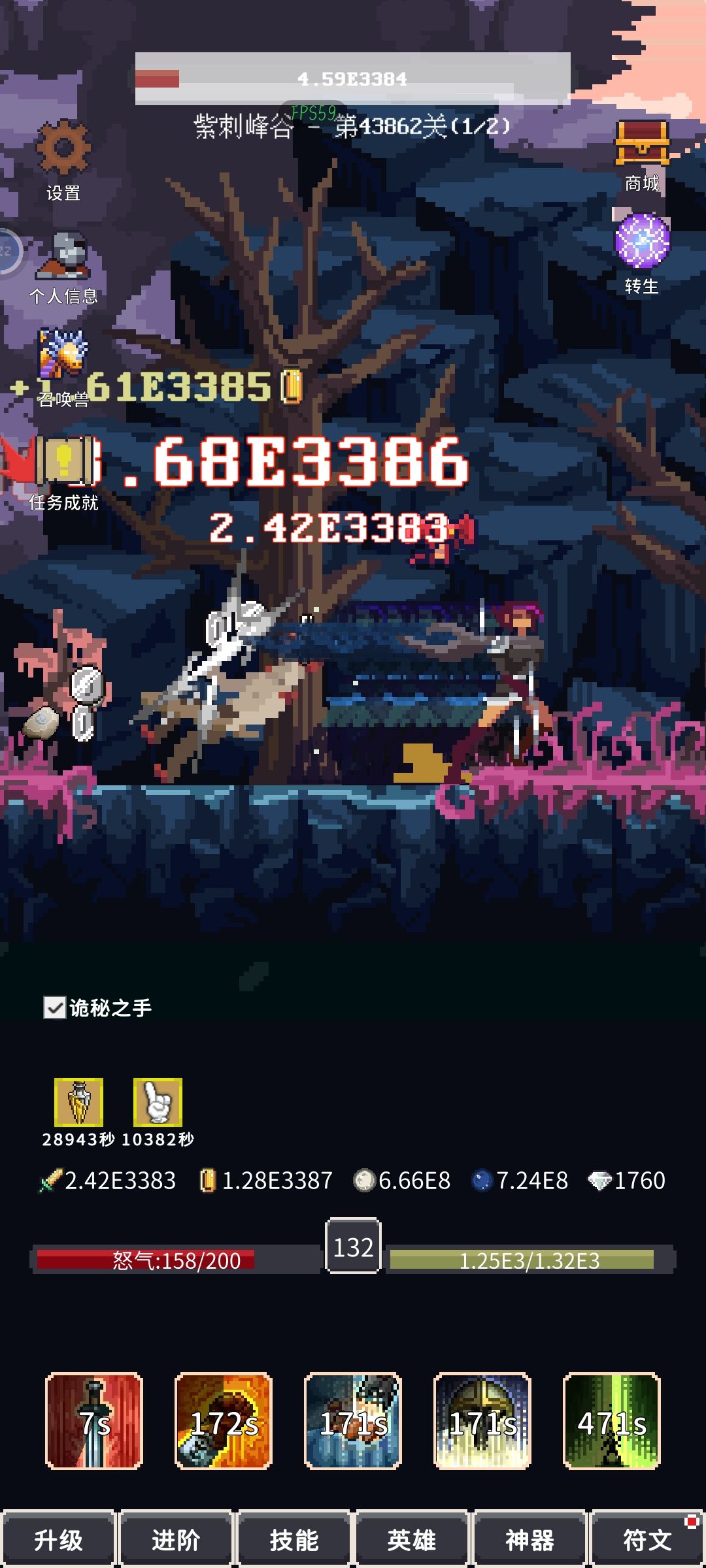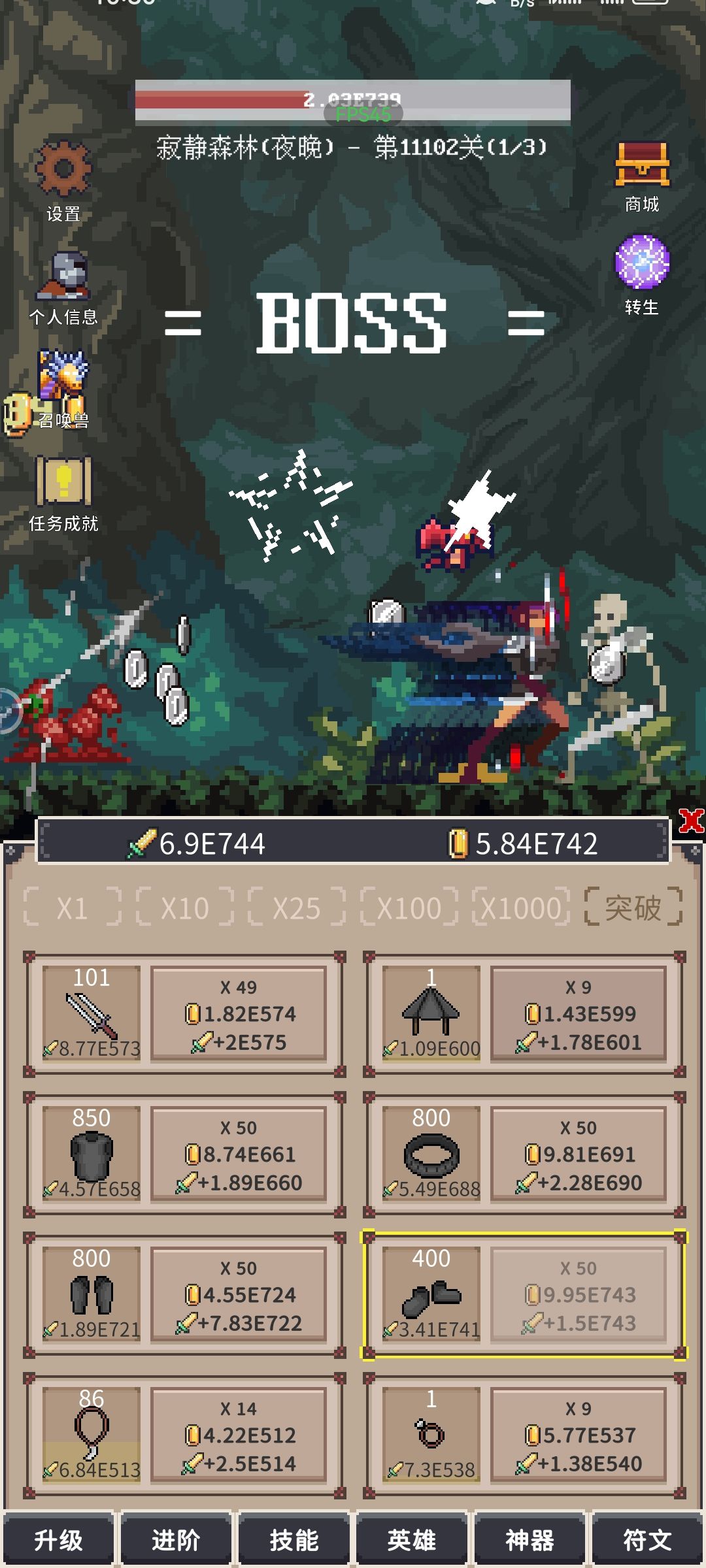 第三天,一共8转,目前开局就是1万关,装备进阶自动,懒得一个个挑。 开局进群领礼包+签到,买完两个宠物,剩下钻石直接买1000的丛林,使劲推到130关,直接重生。第二转能推到哪里推到哪里,推不动了广告领离线6小时的收益,会给可观的魂,然后转生。转生切记不要急着买神器,前期神器等级低收益不大,不去没用完魂的加成,推到推不动,开始买神器,洗神器。然后反复。目前已经非常无聊了