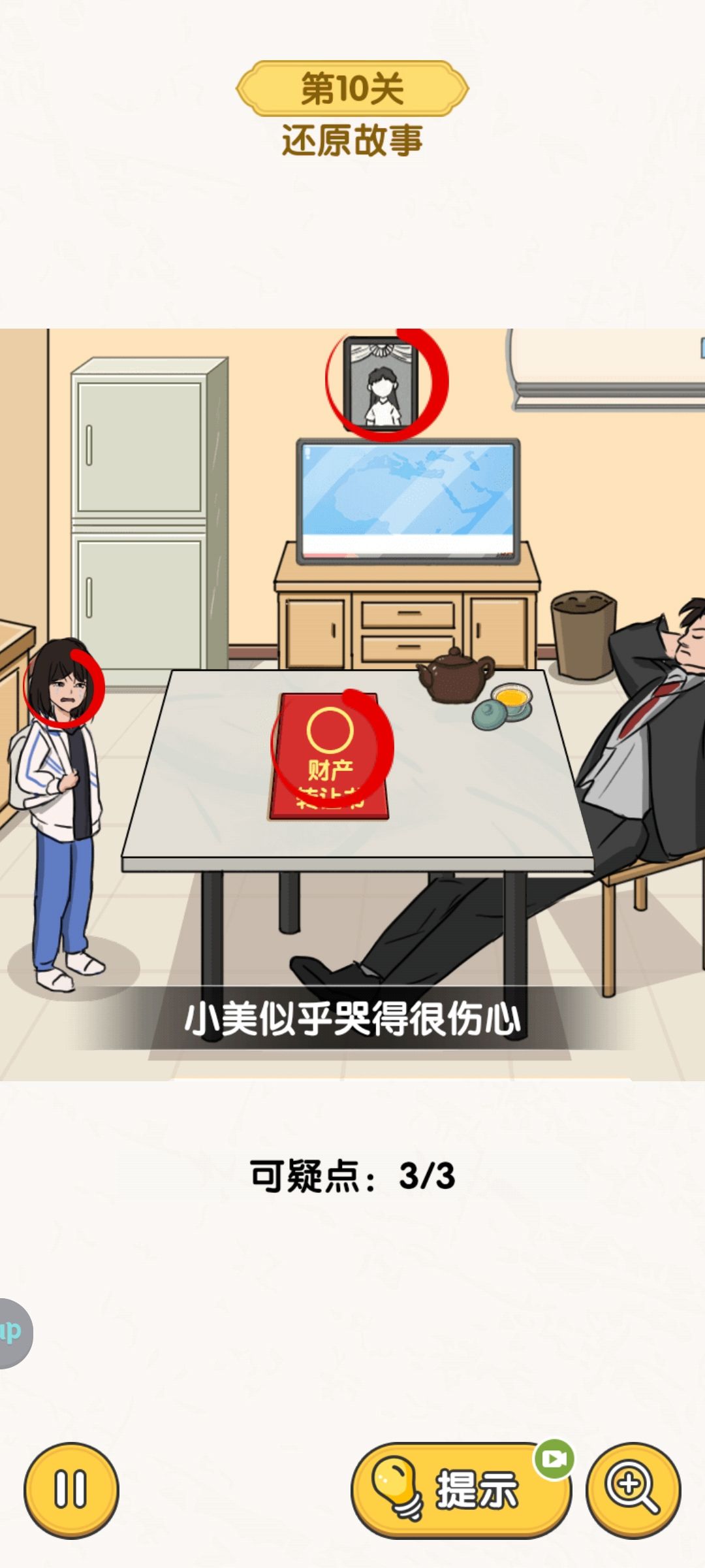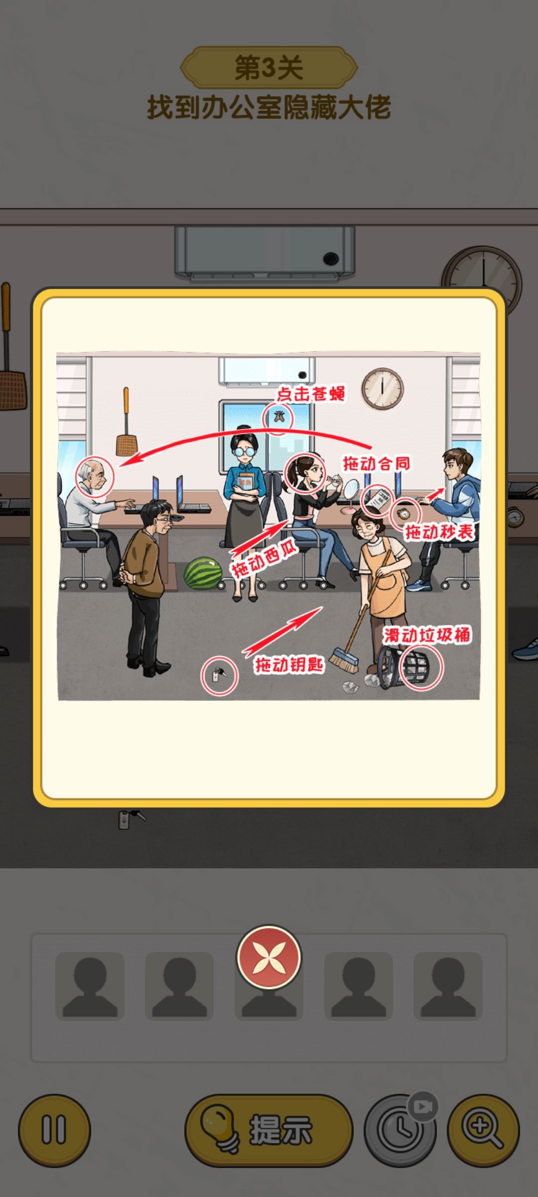 隐藏大佬1.拉合同给大爷前要先拖动桌上手机给大爷,再拖合同才能触发 2.苍蝇需点击多次 3,小伙我是滑动了几次时钟(放大拖更容易)到了五点后,上司通知加班,再下滑他蹲下系鞋带,再拖动桌上秒表给上司才过关的,拖动给小伙我触发不了