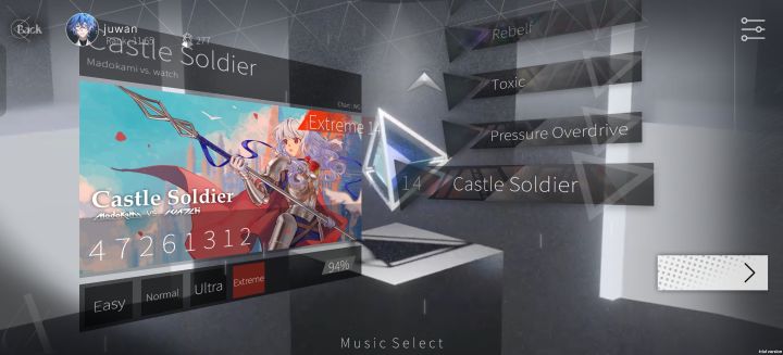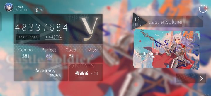 从phigros和milthm来的,晚上下回来玩了一个多小时,rank11.91,体验感觉还行,第一张和第三张(愚人节)图片为初见(迷惑acc),对底力和读谱要求比较大,判定很宽,小屏游戏,对手机不太友好(本人手机),延迟调整感觉把音乐调前点手感好些,速度补偿不建议开,本人流速开的150m/s,整体难度不算特别简单