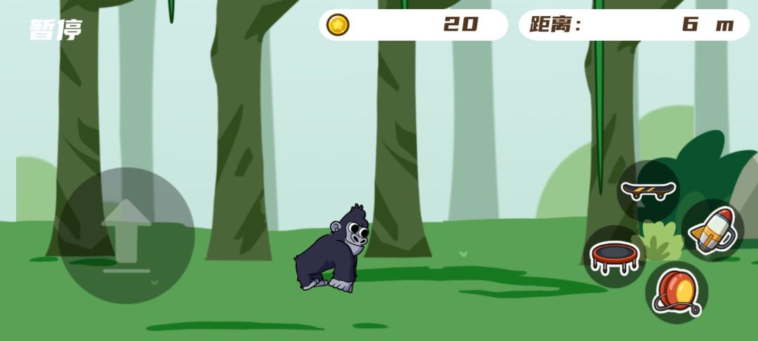 刚从笼子里逃出的大猩猩在森林里努力的逃跑,点击屏幕操作按钮,运用藤蔓和道具帮助他逃离猎人的魔爪。
