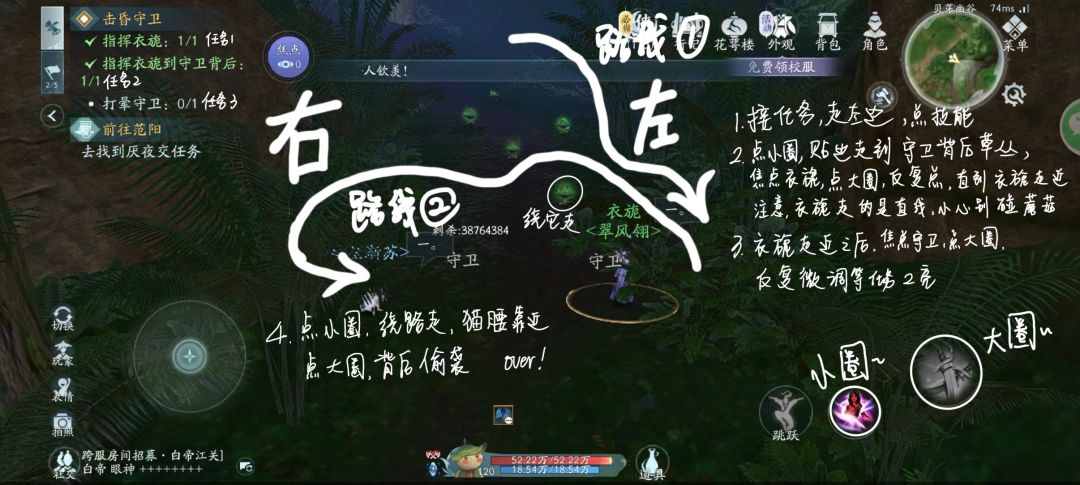 事先说明: 1.左右是按照从接任务的地方走到守卫的这个方向分的,所以图片上的右边是左边,图上的左边是右边 2.任务技能3个,分别是①切换角色②移动npc③攻击守卫,一般情况下,①切换角色技能是和“跳跃”技能同等大小的且在它右边的那个,②移动npc是最大的那个技能圈圈,③攻击守卫在最后会顶掉②移动npc占据最大的那个圈圈 任务流程: 路线①:确定npc的位置 1.接取任务,npc会走到道路的左边,走