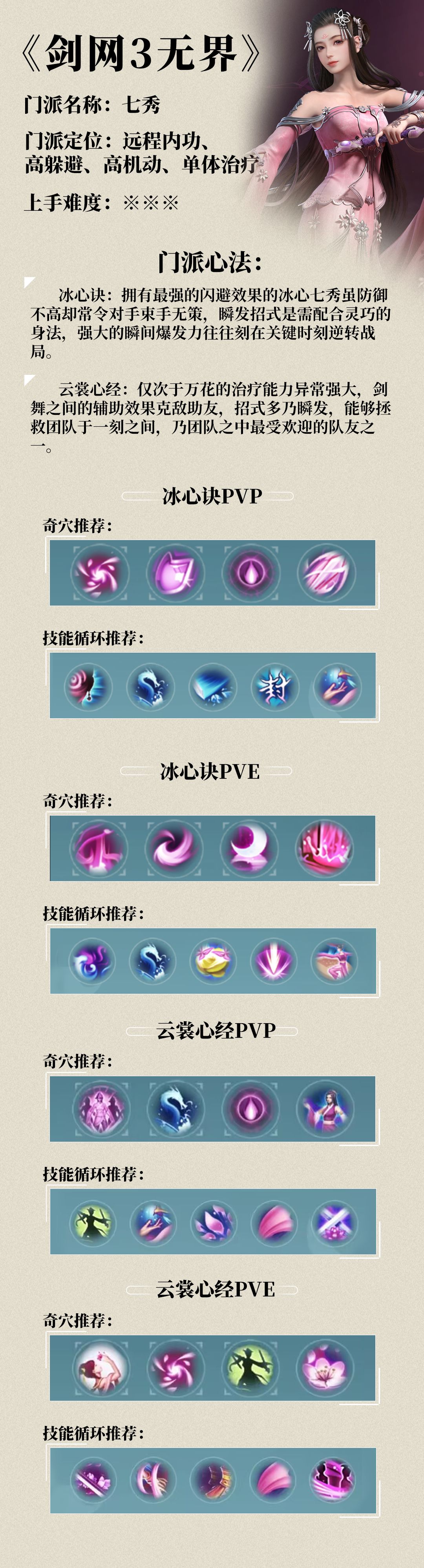 七秀,远程内功、双心法门派。 门派特点为高闪避、高机动、高爆发,操作简单,非常适合刚入坑的萌新试玩。 其两个心法分别为:“冰心诀”(输出)和“云裳心经”(治疗)。 “冰心诀”拥有着较高爆发,在pve、pvp表现都不错。“云裳心经”则拥有优秀的奶量、无损战复(战斗中复活队友)、团队增益,在pve团本非常受欢迎,pvp目前被削弱不太吃香。#剑网3无界 #剑网3无界攻略 #游戏攻略