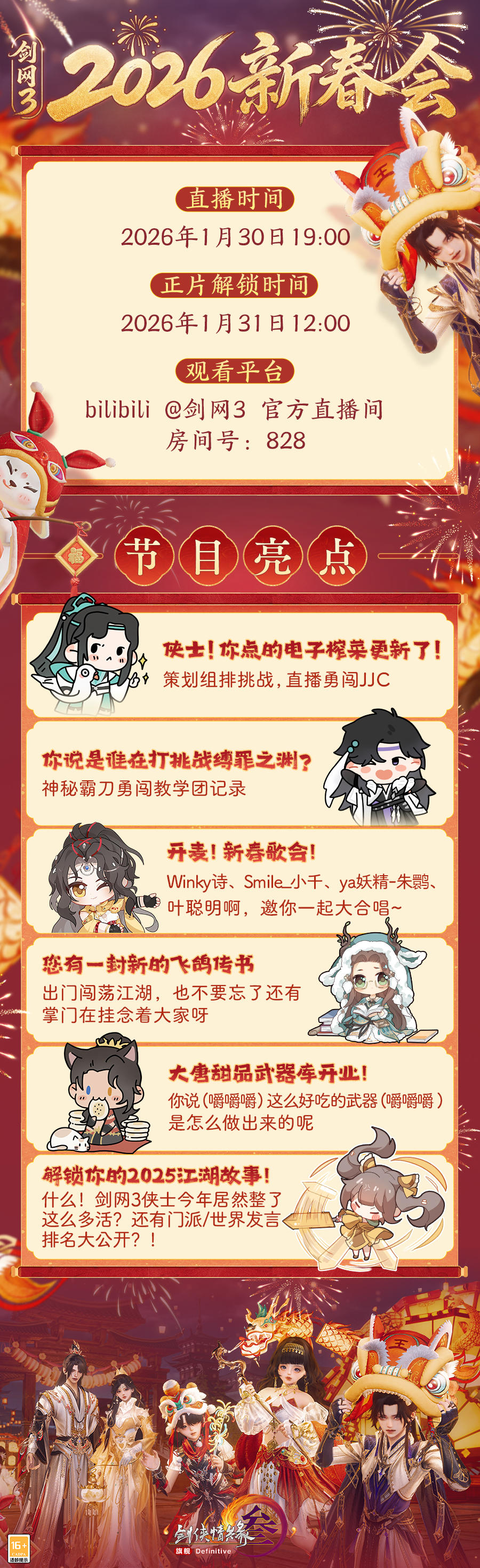 喜迎新春,江湖同欢!《剑网3》邀侠士共迎佳节,线上新春会精彩不停,线下吃粮节游园会趣味全开,一同解锁更多年味与惊喜! 2026线上新春会直播欢乐不断,好戏连台!今晚19:00锁定Bilibili剑网3官方直播间,一起收看剑网3番薯自己的新春会!神秘朋友将带来喜闻乐见的电子榨菜环节,新春歌会唱响熟悉的经典旋律,还有掌门寄来新春家书,暖心关怀随信而至……更多精彩内容,相约《剑网3》2026新春会!