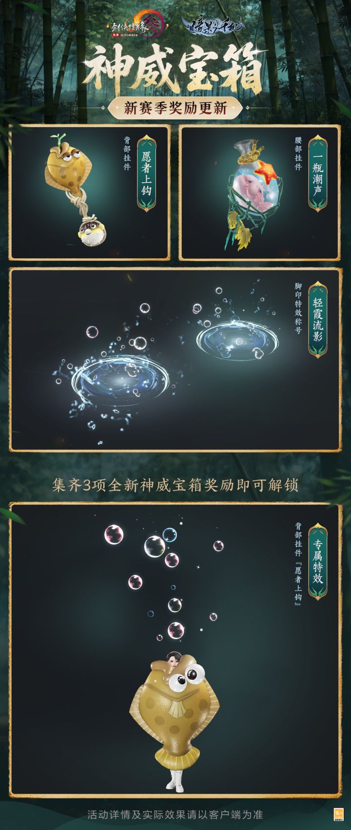 挥戈逐锋,在无限对战中觅得武学真意;以战会友,于快意切磋间遍识江湖知己!鏖战历尽,殊荣加身!《剑网3》名剑大会段位奖励、拭剑宝箱与神威宝箱奖励今日亮相,奇珍纷呈,共随侠行! 名剑大会段位奖励与全新宝箱奖励神威宝箱奖励脚印特效称号“轻霞流影”在步履间漾开层层涟漪,轻盈气泡徐徐浮动,恍若云霞碎落,步步生虹。集齐三件套更可解锁背部挂件“愿者上钩”专属特效,梦幻泡影,如影随行。 全新拭剑宝箱以嶙峋