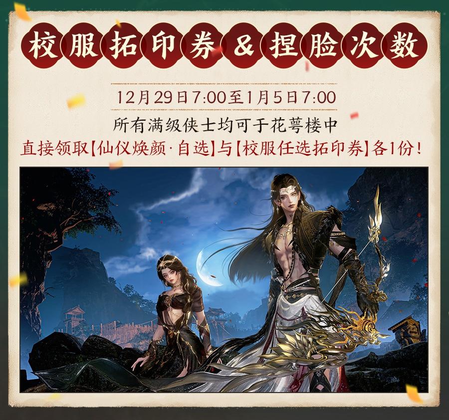 结庐江湖迎新岁,盏中温酒待新程,《剑网3》家园与百战异闻录新赛季等重磅内容正式上线,江湖路远,相伴而行!• 登录领好礼• 锦绣霓裳活动• 家园新赛季• 百战新赛季• 更多精彩内容登录领好礼岁末将至,与侠士又共度一年!值此辞旧迎新之际,感恩诸位一路同行,特备好礼相赠!即日起所有满级侠士均可前往花萼楼领取【仙仪焕颜·自选】与【校服任选拓印券】,愿与侠士共赴新岁,同书江湖新篇章! 使用【