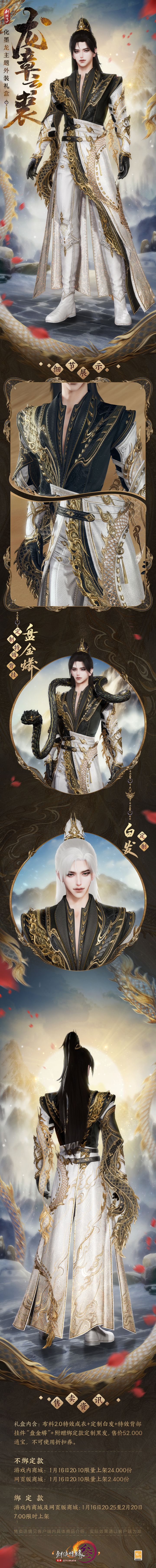 春节贺岁系列新品将于1月16日琳琅登场! ✦ 化墨龙主题外装礼盒“龙章云裘”服饰与挂件特效 ✦ 全新成衣套装“缈乐寻香”服饰及定制黑发、红发 ✦ 奢华包身礼盒“香兰沁雪”服饰与包身特效 ✦ 蛇年贺岁红发“心上砂” ✦ 瑞蛇主题头饰
