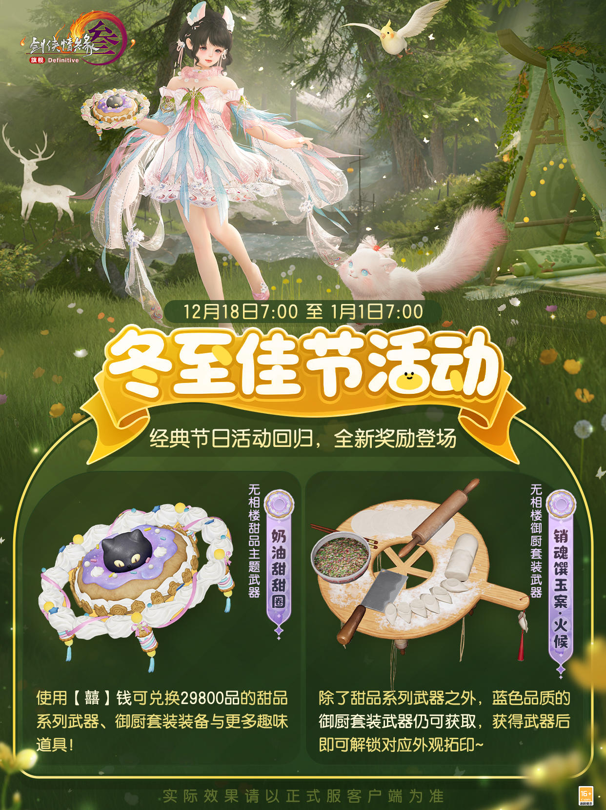 冬阳融雪,甜暖入怀,《剑网3》全新甜品主题武器12月18日上线,还有波斯衍生外装礼盒同步登场!此间精彩纷呈,诚邀诸君一睹风采! 全新甜品主题武器天寒情意暖,欢庆话安康,冬至佳节活动将于12月18日开启,无相楼御厨套装武器【销魂馔玉案·火候】现已登场,还有29800品各门派御厨装备上新,助力侠士无畏破难!与此同时,全新甜品主题武器奖励甜蜜亮相,前往体验冬至活动积攒代币即可兑换,为侠士的冬日添一