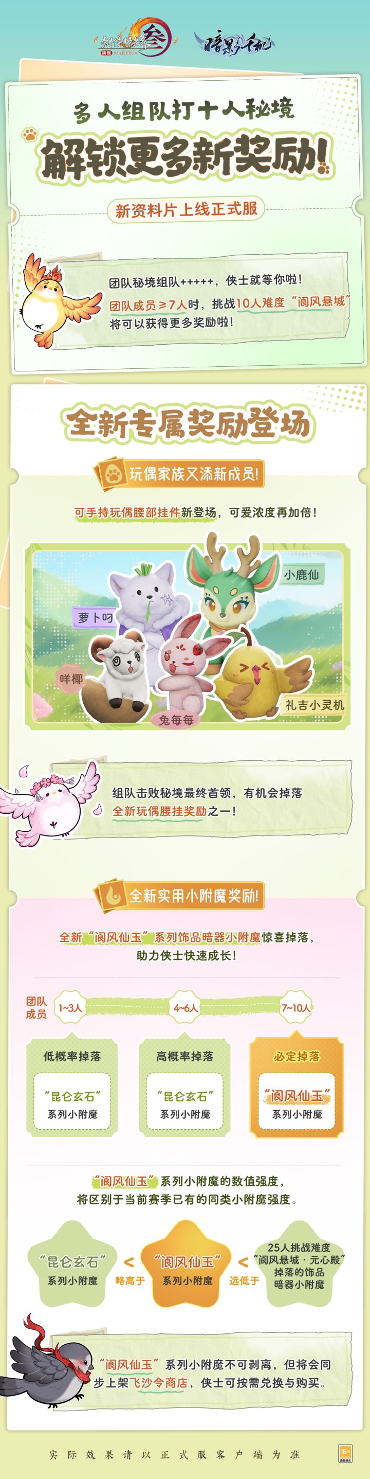 组队通关十人团队秘境,获取更强力的附魔与可爱的玩偶挂件!《剑网3》十人秘境全新奖励与全新宠物奇遇将于新资料片与侠士见面! 组队挑战十人秘境更多奖励挑战难度不变,收益更丰厚!新资料片开启后,当满足团队成员至少7人的条件时,侠士组队挑战10人难度“阆风悬城”将可获得更多奖励!其中,“阆风仙玉”系列饰品暗器小附魔将替代原有的“昆仑玄石”系列小附魔掉落,助力侠士快速成长!“阆风仙玉”小附魔数值将高于