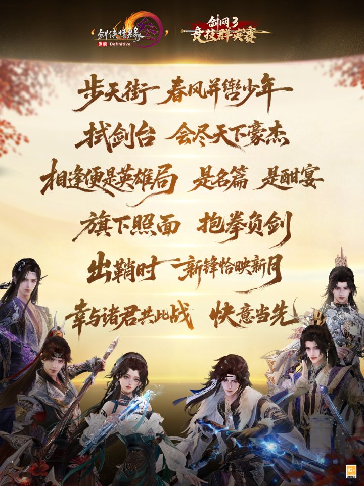 赛事竞技点燃激情,热血共书武林新章!《剑网3》全新竞技群英赛系列新品将于3月19日上线!• 第二届竞技群英赛宣传曲预告• 竞技群英赛炽焰主题套装“朱明摇光”• 竞技群英赛全新手饰“稚麟绵”• 新资料片首测资格现已开放申请 第二届竞技群英赛宣传曲预告少年策马扬鞭,正揽满目风华!第二届《剑网3》竞技群英赛64强赛事即将开战,宣传曲MV《刀剑应答我》将于3月19日正式登场!又逢一年群侠盛会