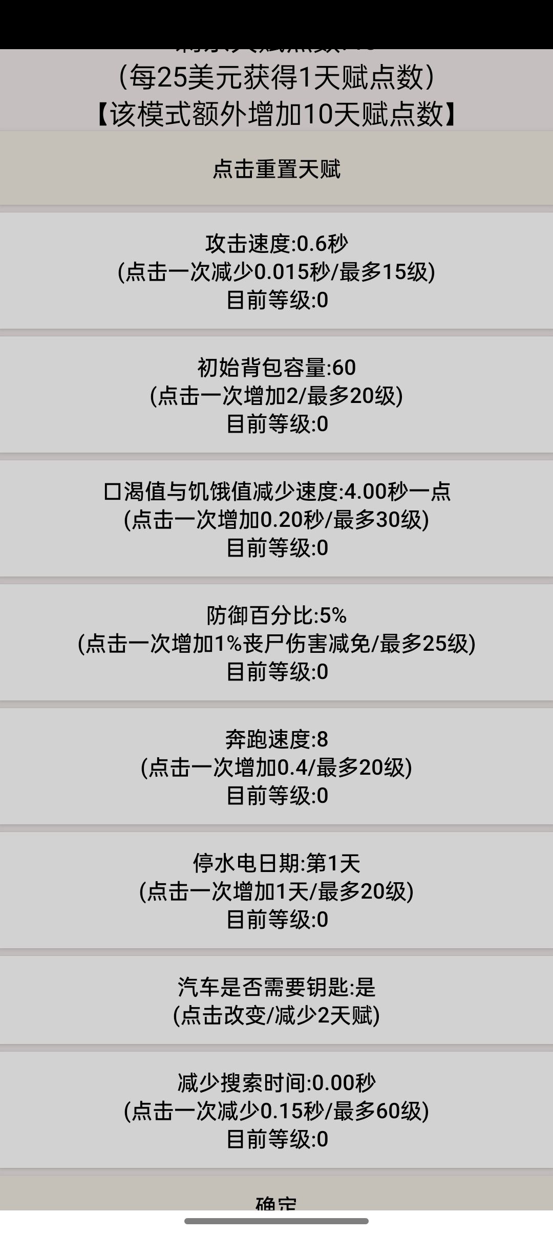 #幸存者传染病 我认为这个游戏纯看脸,运气好可以活好几天,运气不好,第一天就噶。 我觉得捡到的钱应该攒起来,不要花,钱越多,可以用来升天赋,前期靠脸,后期靠天赋 ①我认为最重要的天赋是 攻击速度和防御力。 一般开局都会遇到成堆的丧尸,攻速和防御力加上一把称手并且武器耐久高的武器可以度过前期。前期一般不缺食物和水,所以消耗快是能接受的。有人可能胆心搜索速度慢,消耗程度可能抵不住。我想说你想多了,你