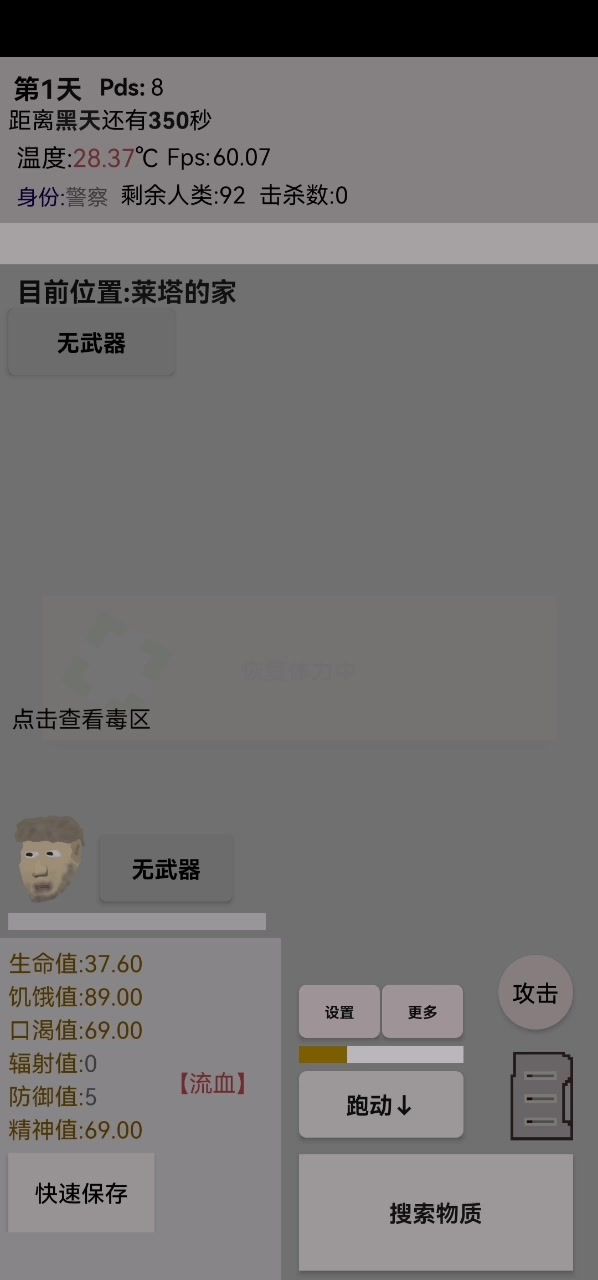 玩了接近一个星期了我的评价是bug有点多。而且很多地方不合理。比如大逃杀模式100人分1000块且只有最后一个人能拿到手。最离谱的是一天减200相当于5天决胜负要不然就血本无归。然后概率问题。我遇见的每一个人类都有枪刚看见是人还是僵尸我就已经身种中好几枪……然后前期拿不到武器就彻底牢住了(而且拿不到武器还是大多数情况👿概率之小令人发指)然后没有背包也相当牢一瓶水一块肉一个斧头就已经占据了60这样的