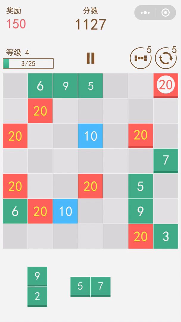 已上线微信小游戏:《1020》新版本可以说说2.0版,有比较大改动,游戏更注重连击效果。三个10消除改为所在直线其他数字+1;三个20消除改为所在直线其他数字+2;这样三消后,改变其他数字,可发生更多连击效果!!现在生成10,20不再是可拖拽状态,是每隔几个出一个可拖拽状态。底部数字选项不能放置时,不会直接结束,而是随机出新数字直至填满,才游戏结束。这样更加刺激,会有机会抢救回来。新