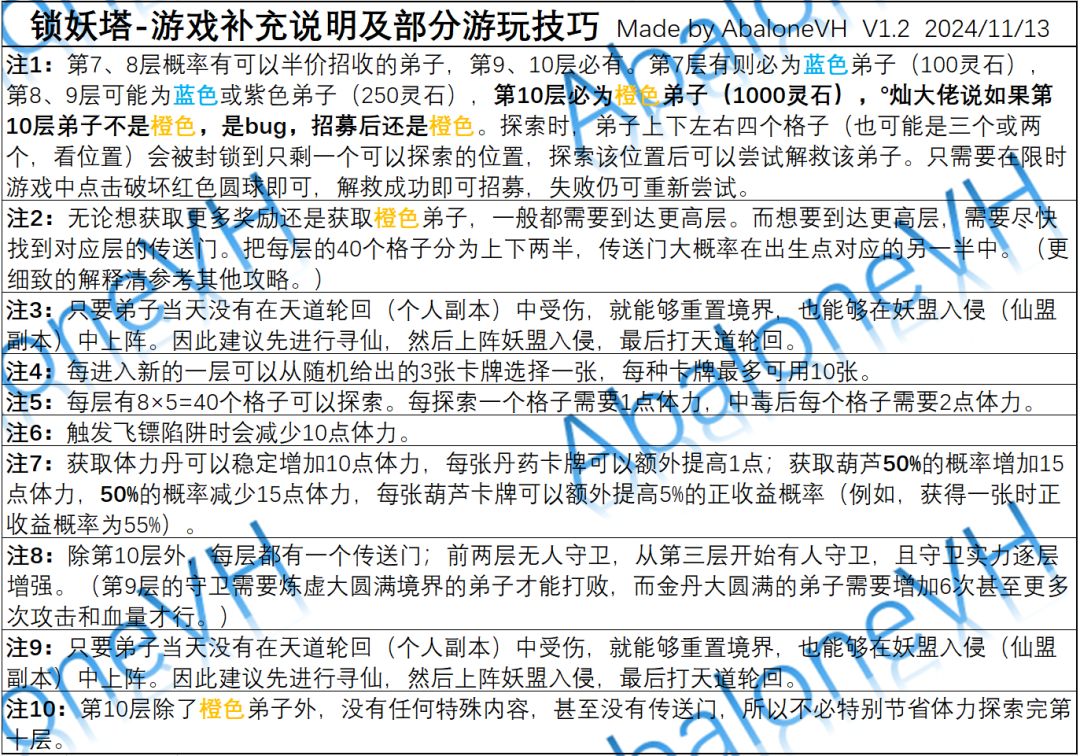 分享一下自己整理的锁妖塔说明,是游戏中锁妖塔说明的补充和细化。欢迎各位补充~(爬塔方法其他攻略已经细说过了,这里不再赘述) 信息/攻略分享汇总 https://www.taptap.cn/moment/605175129328061635 更新日志 2024/11/13 v1.1 更新了第一张表格的细节,更新内容用粗体标注。 2024/11/10 v1.0 介绍锁妖塔