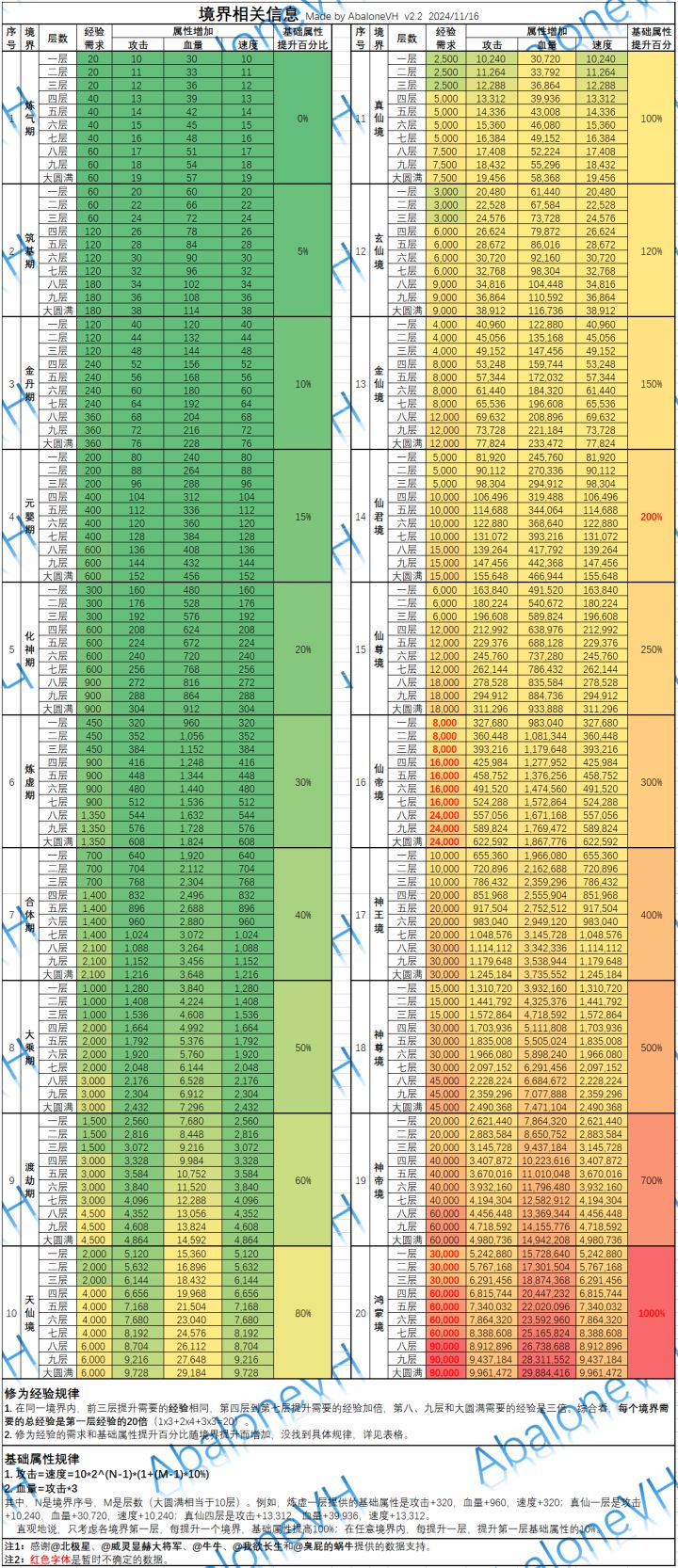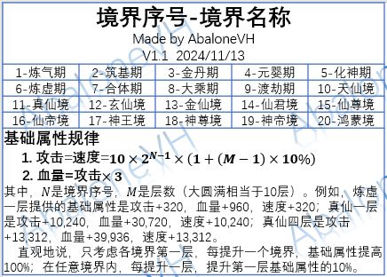 境界相关信息如图1所示,图2为图1的部分内容。图1中还有部分信息尚不确定(红色字体标出),欢迎各位提供信息来补充。装备打造等级规律如下:天品首次有概率(0.01%)直接打造是在16级,之后每6级出现下一品质。具体如下:仙品22级,神品28级,神品1星34级(神品N星为(28+6xN)级,已验证至神品7星),神品10星为88级。新出的灵宝猜测也是这个规律,即灵宝1星94级,(灵宝N星为(88