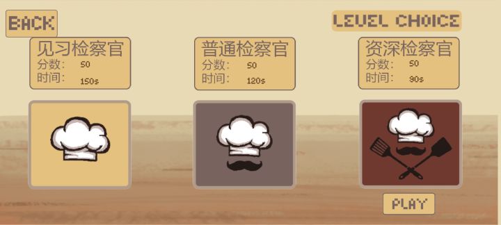 一共有三种模式,见习什么什么的,我记不太清。游戏玩法就是检验食物,左下角手拿着筷子的图标点一下是把菜翻过来,如果有虫子什么的,就是菜里本来不应该出现的,那么点那个重做。第二个图标是一个嘴,是试吃,点一下后会出现一句话,指味道方面怎么样,左上角是顾客的要求,如果与这句话对上了那么就重做。第三个图标大概就是重做吧,我不太清楚了。