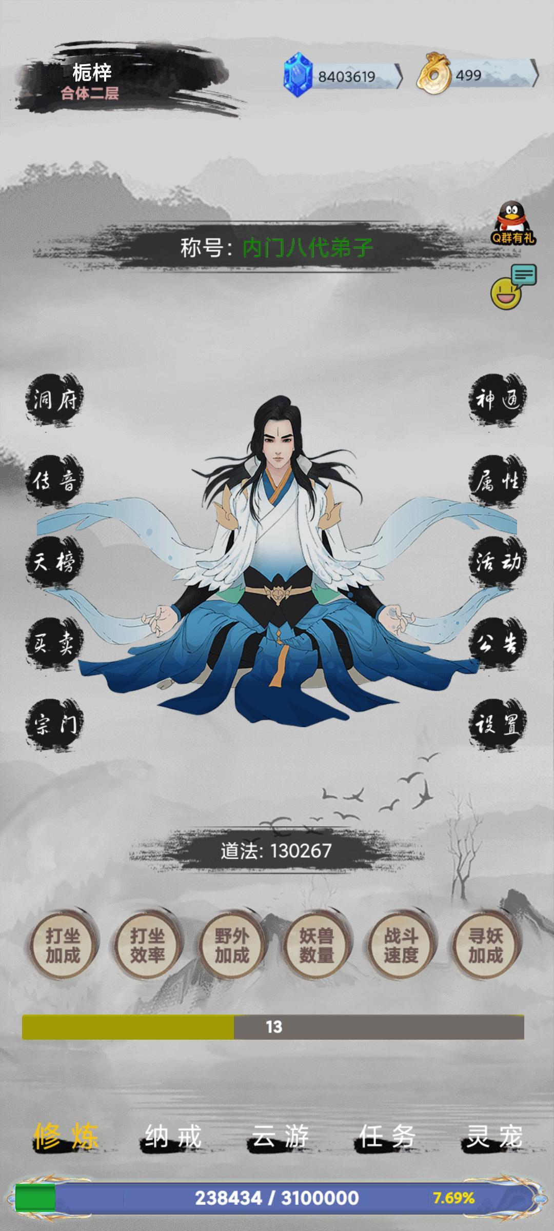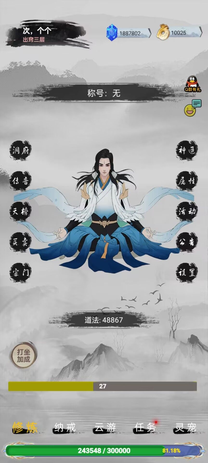 全民修真时代是一款放置佛系休闲类游戏,佛系养老 自由组队 离线挂机 自由交易等玩法应有尽有以下是一些游戏介绍: 游戏背景:全民修真时代设定在一个修真世界,玩家需要通过修炼、战斗等方式提升自己的实力,成为修真界的强者。 门派选择:游戏中有多个门派供玩家选择,每个门派都有自己独特的特点和神通。加入门派后可通过接取宗门任务和宗门试炼获取宗门贡献从而提升宗门地位亦可换取各种物品!玩家可以根据自己的喜好和游
