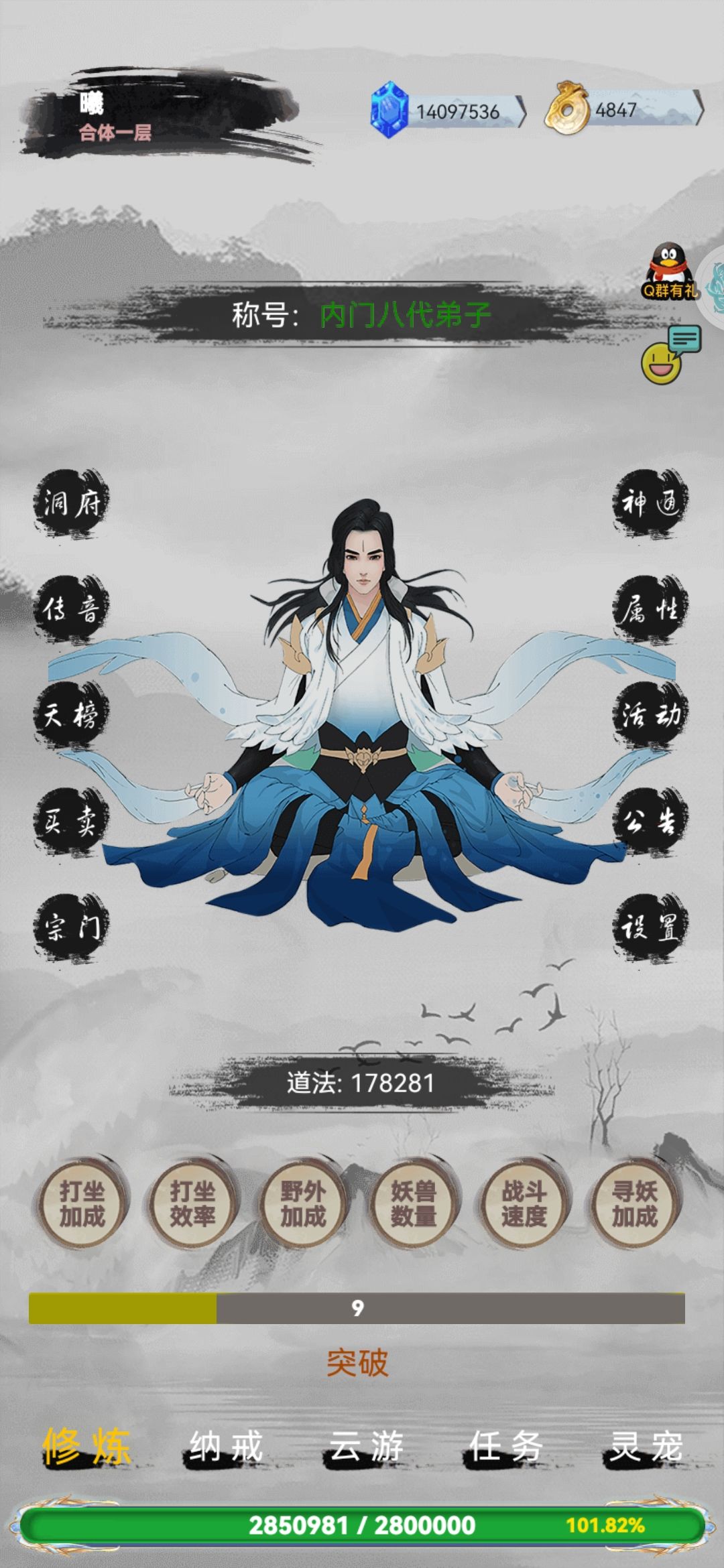 全民修真时代攻略进入游戏后,从四个人物形象里选择一个,创好角色名,便可以开始属于你的修仙之旅啦。游戏的境界分为:凡人境,练气境,筑基境,金丹境,元婴境,出窍境,分神境,合体境,大乘境,渡劫境等等每个境界又分为1,2,3,4,5,6,7,8,9 和圆满游戏的装备品质,宠物品质,法宝品质分为:白,绿,蓝,紫,黄,红游戏的主要货币为:灵石:可以通过刷图,洞府挖矿,装备分解,佣兵,锁妖塔,每日签到,每日福