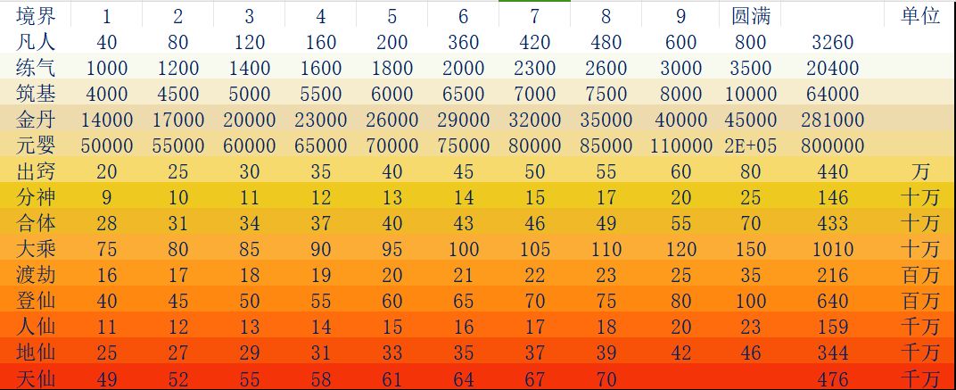 汇总境界经验需求表