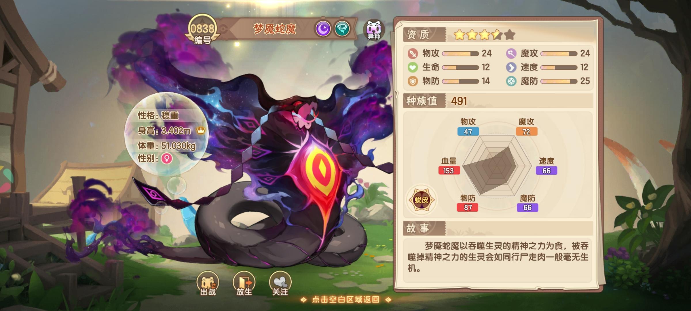 月色下,精灵们静静入梦。然而,并非所有梦境都宁静惬意……请跟着普普来看看本周即将上线的精灵们吧!注:精灵绝招中的特殊攻击将以精灵突出的物/魔攻属性作为绝招属性,具体绝招属性以游戏内自身精灵情况为主。○梦魇蛇魔○盗梦蛇会潜入人们的梦境之中盗取精神力,被盗取了一部分精神力的人们往往会做一场极为恐怖的噩梦。梦魇蛇魔以吞噬生灵的精神之力为食,被吞噬掉精神之力的生灵会如同行尸走肉一般毫无生机。>