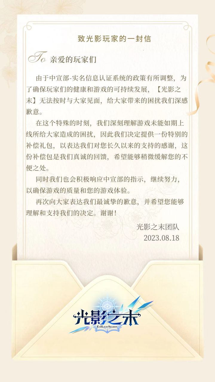亲爱的魔法师们: 我们荣幸地宣布,大家期待已久的【光影之末】正式开服,欢迎大家尽快去tap平台下载并加入这个充满冒险与挑战的世界! 为了让大家更好的冒险,我们特别准备了一系列活动和福利。首先,所有新注册的玩家都可以领取豪华登录礼包,内含丰富的游戏资源和道具。此外,补偿礼包已在【利斯特】大陆等待大家开启,一个SSR角色等待大家认领。 我们将竭尽全力提供稳定的游戏环境和优质的游戏体验。 在这