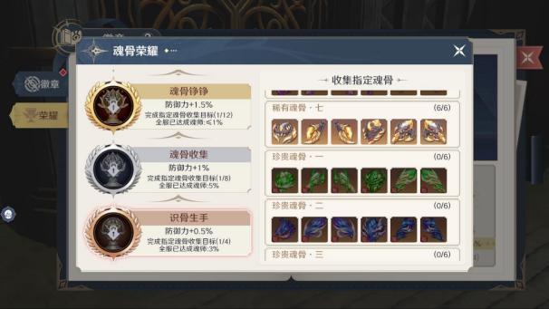 就像珍心法、珍魂卡一样,在游戏的中后期会出现珍魂骨。有许多玩家在这个阶段很容易犯嘀咕,毕竟养一套珍魂骨还是比较费劲儿的,那今天我来给各位分享下,当前版本我对于珍魂骨的理解和推荐,希望能够给大家带来帮助。 首先对珍魂骨没有概念的玩家,可以在游戏主界面,依次点击更多-徽章-荣耀-识骨生手处查看 每个魂骨的套装效果。 当前版本共有 6 套珍魂骨,目前个人仅推荐其中的三套。 生命凝实 4 件套减伤+反伤;