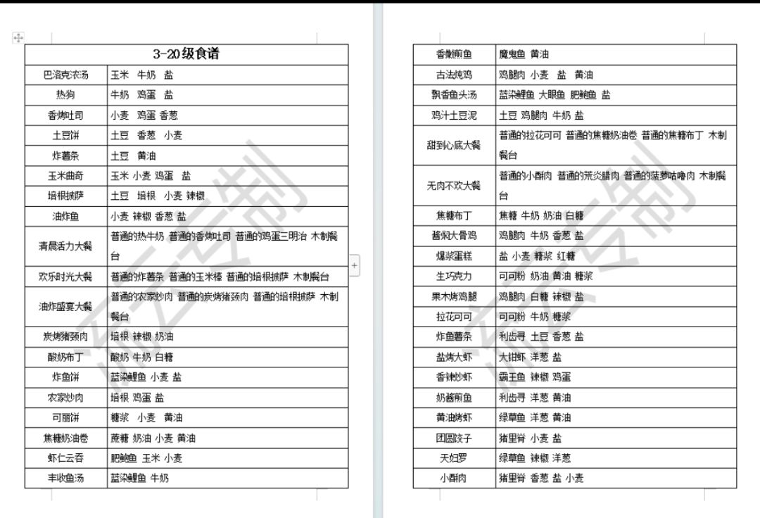 烹饪3-20级54种菜谱,80满菜谱后续26种补充