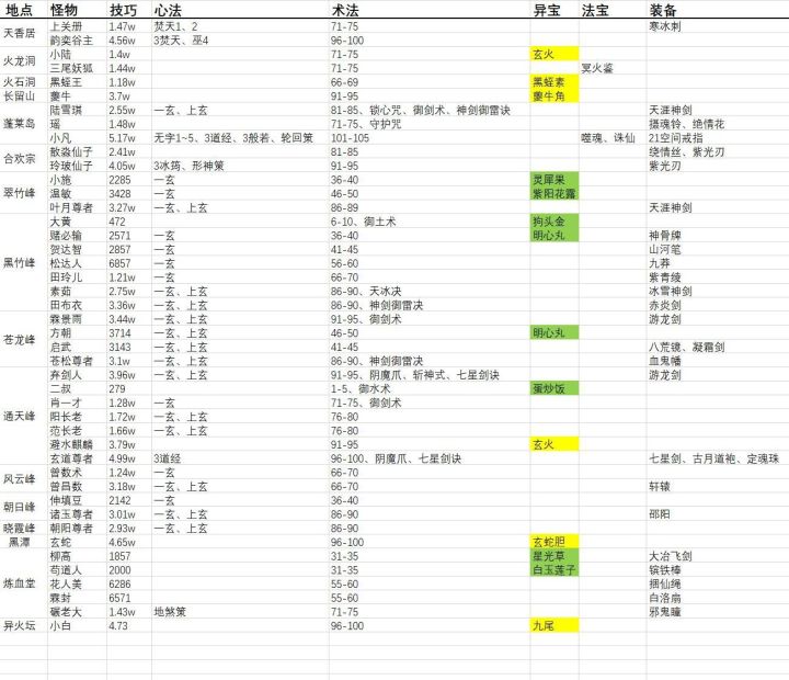 2024/1/28,在Q群小伙伴们的数据+市场售卖,更新下术法信息首先感谢《無》小伙伴的数据帮助诛仙风云boss掉落 - TapTap然后就是劳碌的数据收集整理。制式功法写着写着发现好像都能掉,应该是全图掉落的,就不在管了。新手可以青山门那边混个一玄道经,第二个术法混个50灵的功法带着(首个功法学灵力需求最高的,有心法研习后首个功法好像能堆着一堆灵力学超过当前等级的)。左侧特殊一点的可