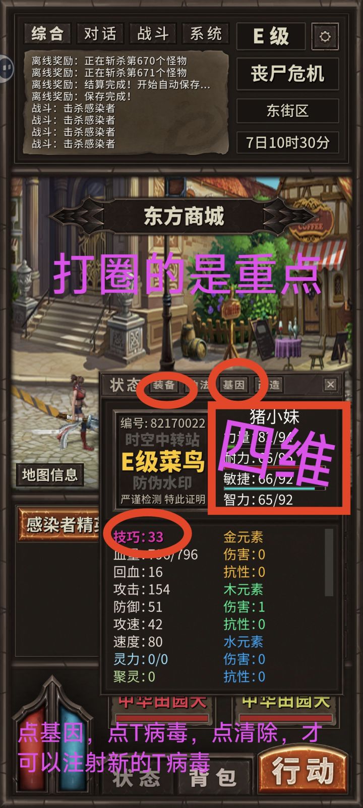 第一点:这个游戏要把商店玩明白,主打提前刷够下阶段装备,五分钟没有刷到,就过一两个小时再刷,红脑是保证越阶的必备装备,建议把boos券用在打脑boos,进c图一定要留点boos券,刷三黄霸主四维的功法,刷到以后先把技巧的功法挂机研习的差不多了,再研习其他功法,不然打不过boos第二点,基因,我d图的前面几个基因不是红闪一直刷不到还有点遗憾,没想到进c图必须删掉前面的基因才能注射,所以大家不用刻意