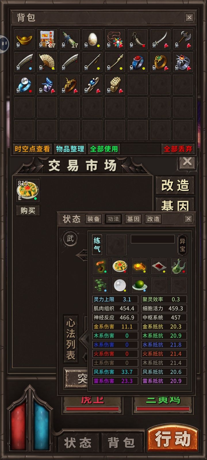 第一点:这个游戏要把商店玩明白,主打提前刷够下阶段装备,五分钟没有刷到,就过一两个小时再刷,红脑是保证越阶的必备装备,建议把boos券用在打脑boos,进c图一定要留点boos券,刷三黄霸主四维的功法,刷到以后先把技巧的功法挂机研习的差不多了,再研习其他功法,不然打不过boos第二点,基因,我d图的前面几个基因不是红闪一直刷不到还有点遗憾,没想到进c图必须删掉前面的基因才能注射,所以大家不用刻意