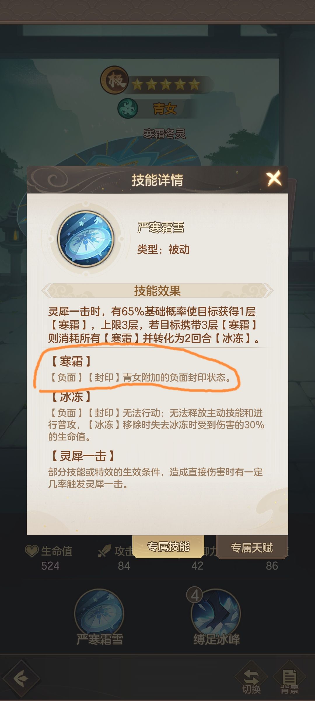 青女加望玉烟,真的被恶心到了[表情_生气]青女的寒霜明明什么效果都没,但偏偏属于封印状态,最重要的是没有持续回合数限制,能持续到战斗结束[表情_汗]而且开场就给你全体挂一层寒霜,直接持续到战斗结束[表情_石化]刚古塔秘阁碰到这组合,5回合不到就灭队了[表情_尬笑]望玉烟每回合稳定输出,谁能扛得住啊[表情_汗][表情_汗]