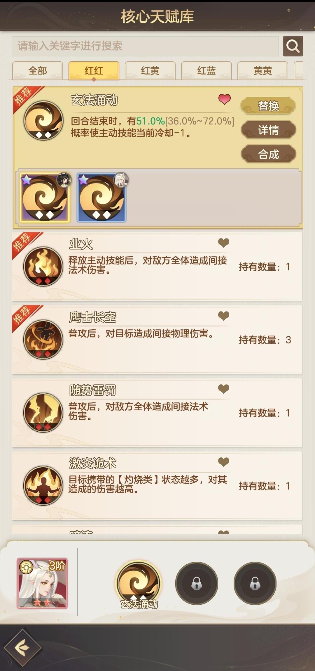 玄法虽然玄法是有几率使技能冷却回合数减一,但是实际上触发的概率并不低。所有依赖于技能释放的阵容都可以带,白泽、炎刑、祝融,甚至清风和建木仙都可以带这个天赋,而且这个天赋获取也并不困难,建议有资源的多搞几个有备无患,就算你玩普攻队,奶妈带这个天赋也不亏。