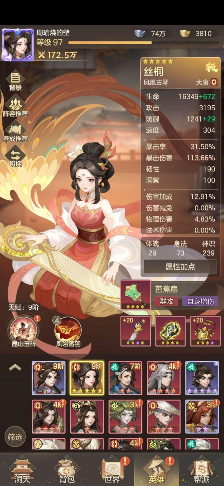 目前走的是清风连击流。打到第七章,有点推不动打算缓缓再推。现在清风、陆压红二,樊梨花红一、建木仙白板。目前是一分钱没氪,纯白嫖玩家,感觉再把一些细节提升一下的话,还能再过几关,这是第三天的成果