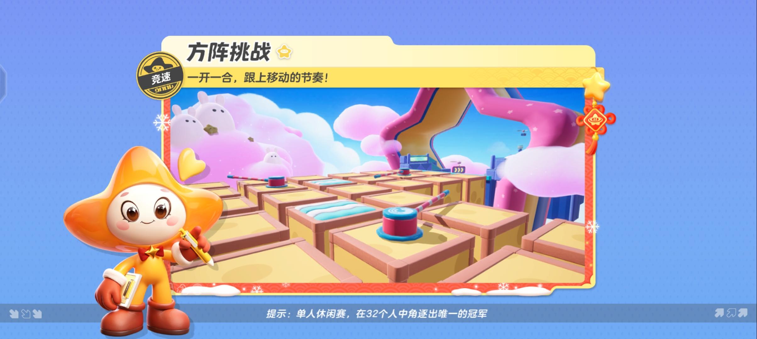 脚下的地板开开合合,一不留神就会踩空?快和星妹一起跟上地板移动的节奏,攻克刺激的机关方阵叭~ 【方阵挑战】是一张竞速地图,星宝们需要在规定时间内穿过会移动的地板,躲避海绵圆柱、旋转栏杆和移动栏杆等障碍物,最终抵达终点取得胜利! 那么接下来,星宝就和星妹一起开启挑战叭~ 游戏开始后星宝们会看到四列移动的地板,两个相邻地板在移动时中间会出现空隙,星宝们要多观察地板移动的轨迹,不要失误踩到空隙掉下去了